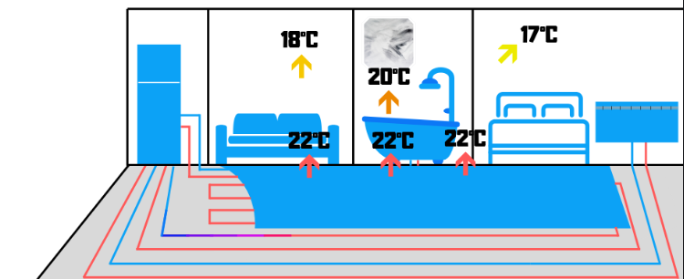 De este modo durante la época de meses fríos haremos circular el agua a una temperatura en torno a los 30-45ºC, circulando el agua por todos los tubos de polietileno reticulado para que envuelva todo el suelo desprendiendo el calor necesario para calefactar el espacio y en los meses de calor haremos moverse el agua sobre unos 15ºC por toda la instalación de suelo radiante, así conseguiremos que atraer la sobra de calor del sitio y dispensaba un bienestar con sensación de frescor.